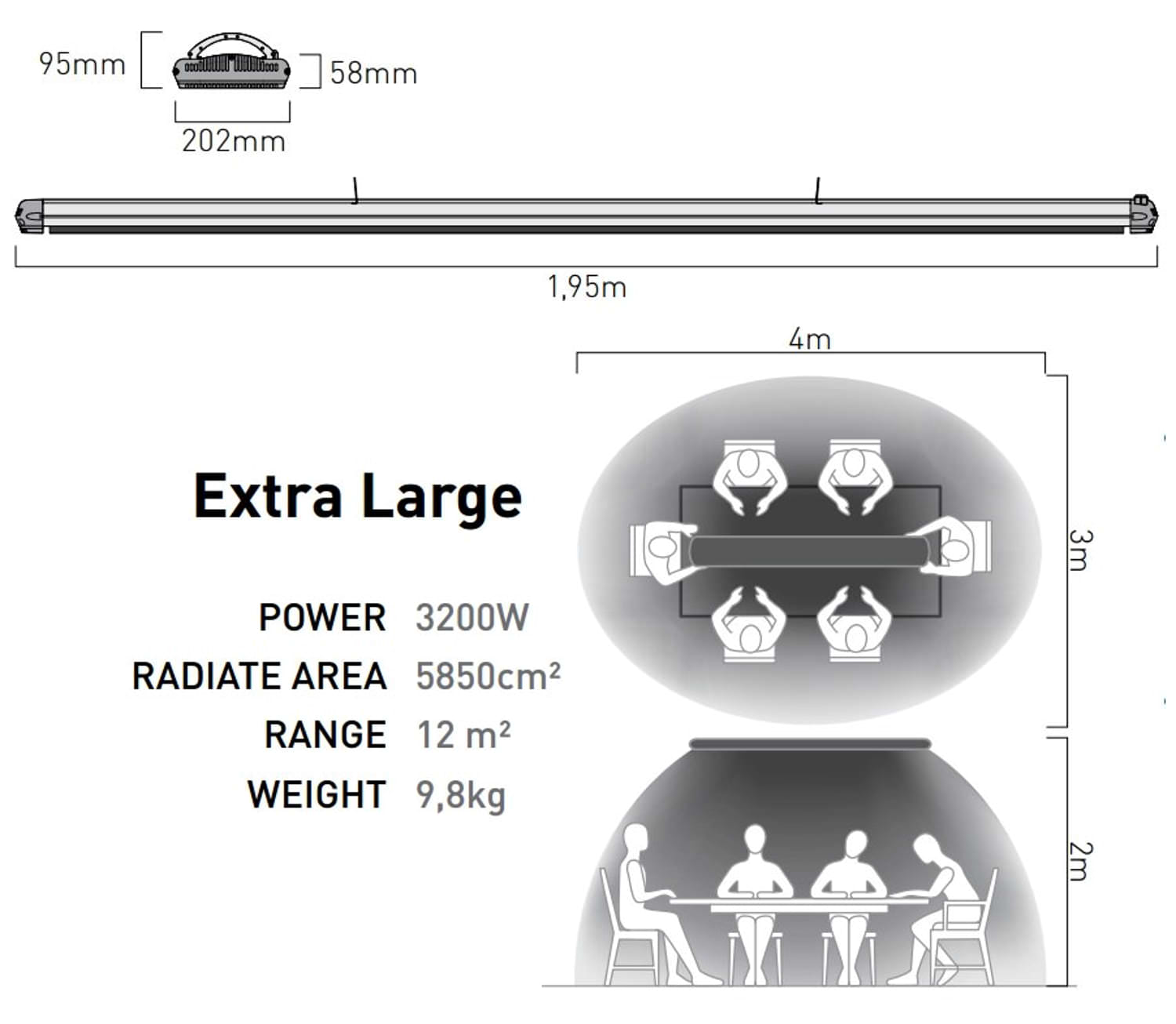 Adecuado para la calefacción de ambientes domésticos tanto privados (apartamentos) como públicos (restaurantes, pubs). Los dispositivos pueden ser utilizados tanto en interiores como en exteriores (patios, terrazas, balcones). El aparato está equipado con un elemento calefactor de doble resistencia. Mando a distancia y regulador La serie HOT-TOP se caracteriza por una presencia discreta, sin luz ni deslumbramiento. Es un infrarrojo tipo IR-C (ondas largas), que calienta las habitaciones y da a los cuerpos una sensación de calor y confort. Tensión de alimentación 220-240 V ~ 50-60 Hz Potencia 2950 W