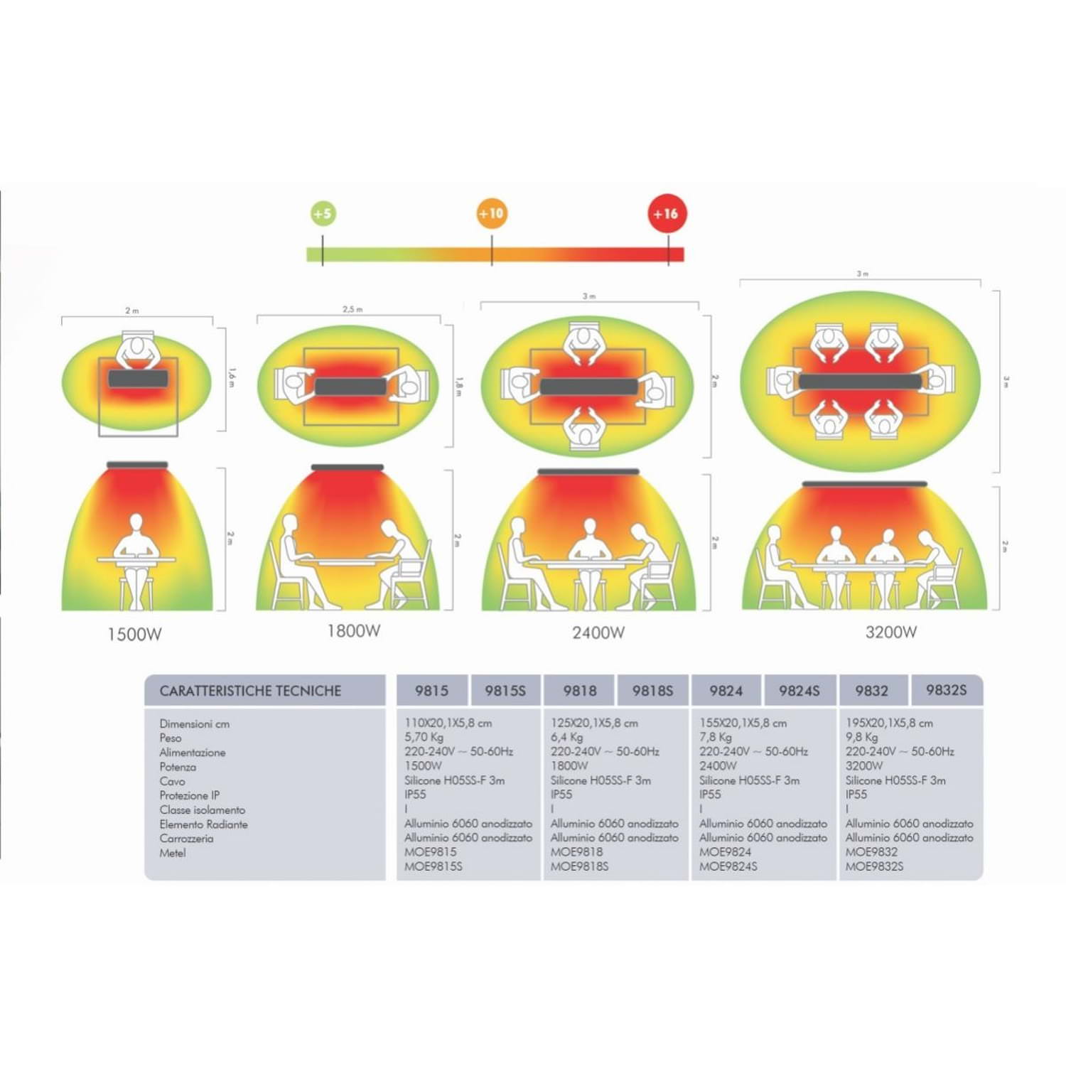 Calentador de infrarrojos de onda larga IR-C Moel 9824 de ondas largas HOT-TOP serie IP55 de aluminio anodizado de 2400W de potencia sin emisión de luz Soporte de pared incluido Calentador de infrarrojos Moel al mejor precioEl panel calefactor se vende sin enchufe Adecuado para la calefacción tanto de viviendas privadas (apartamentos) como públicas (restaurantes, pubs). Los dispositivos pueden utilizarse tanto en interiores como en exteriores (patios, terrazas, balcones). La serie HOT-TOP se caracteriza por una presencia discreta, sin luz ni deslumbramiento. Es un tipo de infrarrojos IR-C (onda larga), que calienta las habitaciones y da a los cuerpos una sensación cálida y confortable. Las líneas modernas y el diseño italiano son perfectos especialmente para los ambientes que se caracterizan por la elegancia y la modernidad. el cuerpo y el cuerpo de calefacción en aluminio anodizado garantizan la irradiación, dando al producto una IDENTIDAD y ELEGANCIA únicas.CARACTERÍSTICAS TÉCNICAS Panel infrarrojo Modelo 9824 Tensión de alimentación 220-240 V ~ 50-60 HzPotencia 2400 WCavo Silicona H05SS-F 3mClase de aislamiento IElemento radiante Aluminio 6060 anodizadoScocca Aluminio 6060 anodizadoNivel de protección IP55Espectro de emisión IR-CP Peso (kg) 7.8Dimensiones (cm) 155X20.1X5.8