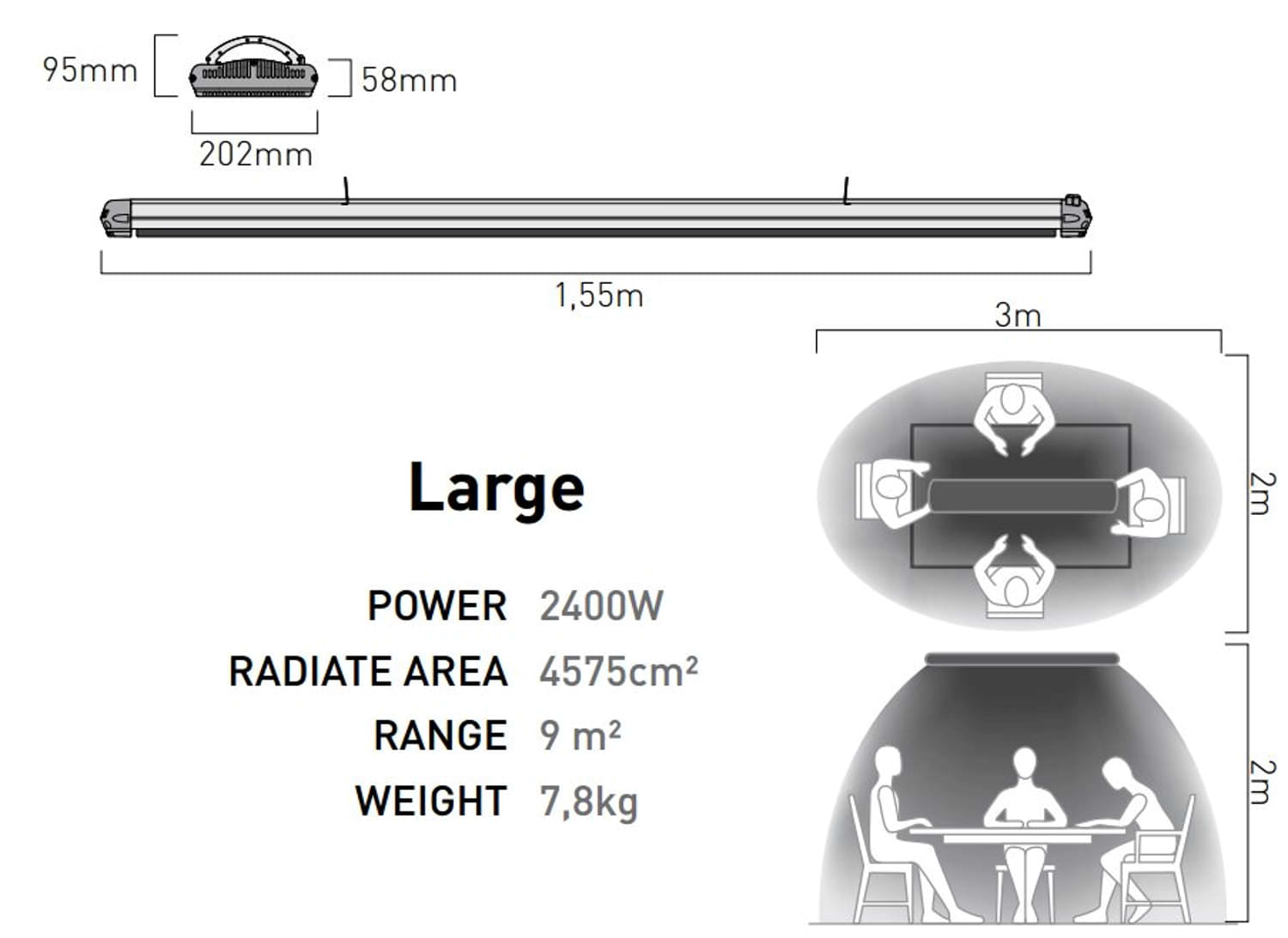 Adecuado para la calefacción de ambientes domésticos tanto privados (apartamentos) como públicos (restaurantes, pubs). Los dispositivos pueden ser utilizados tanto en interiores como en exteriores (patios, terrazas, balcones). El aparato está equipado con un elemento calefactor de doble resistencia. La serie HOT-TOP se caracteriza por una presencia discreta, sin luz ni deslumbramiento. Es un infrarrojo tipo IR-C (ondas largas), que calienta las habitaciones y da a los cuerpos una sensación de calor y confort. Tensión de alimentación 220-240 V ~ 50-60 Hz Potencia 2400 W